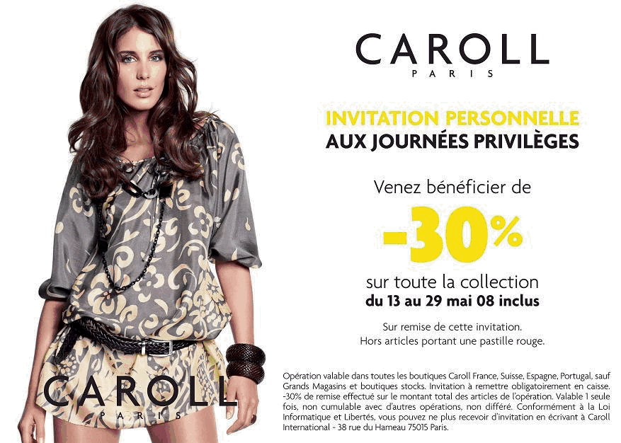 Et bien moi, j’en rentre de chez Caroll, avec une jolie robe qui fait pas mémère et que j’ai donc payée 30% de moins sans qu’on me demande rien. J’ai juste dit en le tendant « j’ai reçu ça par internet » (à mon avis, c’est ça la formule magique). De toute façon, si elles m’avaient dit non, j’aurais laissé la robe sur le comptoir, je m’étais bien brieffée avant. Les filles rigolaient : c’était le premier qu’elles voyaient depuis le début de l’opération !!! Moui, j’habite la cambrousse gersoise… D’ailleurs, c’est bien la première fois que je peux bénéficier d’une remise dont tu parles, Hélène, parce qu’ici, toutes les boutiques pour lesquelles tu fais passer ce genre d’info, y’a pas ! Alors pour une fois, tu penses, je ne voulais pas passer à côté d’une telle occasion !