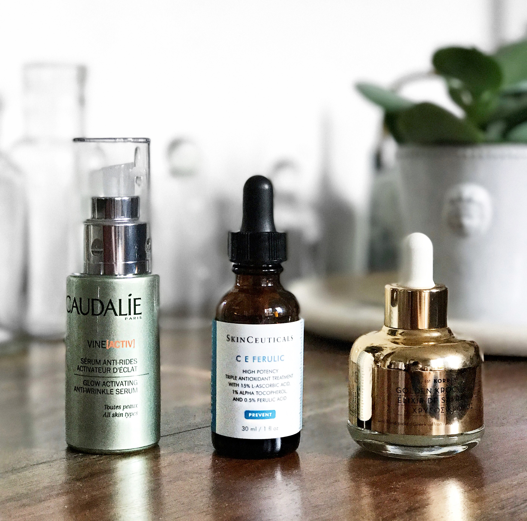 Et pourquoi je vous ai mis uniquement des sérums sur la photo, alors que d’autres produits contiennent aussi des antioxydants (des crèmes visage, par exemple) ? Parce qu’un sérum est beaucoup plus concentré qu’une crème, et pénètre plus dans la peau. Il est donc plus efficace pour cibler des besoin précis (là où la crème sert plus de protection et de bouclier final).