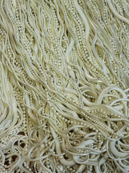 Merci pour cet article, j’ai tout particulièrement apprécié la photo des chaînes ondulantes, les mailles serpent (un fantasme de mon enfance, quand je bavais devant les colliers « argent maille serpent » de ma « grande cousine »)… Et cela m’a fait rêver à une autre vie, je suis fascinée par l’artisanat, et si en plus cet artisanat a à voir avec les atours féminins, alors…