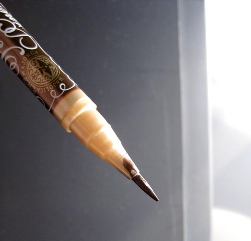 Pour ce qui est du liner, heureusement que la procédure de mise en service était expliquée en pictogrammes sur l’emballage ! En effet, il faut enlever la sécurité du capuchon et percer le conduit qui amène le liquide à la pointe – ce qui veut dire au moins que votre liner ne risque pas de sécher et se conserve longtemps tant qu’il n’est pas mis en service. Le mien est bronze, et la couleur et très belle (il y en a 4 ou 5 autres). Je trouve le liner assez liquide, surtout que j’ai l’habitude du gel, mais la pointe bien raide est un plus dans l’application.