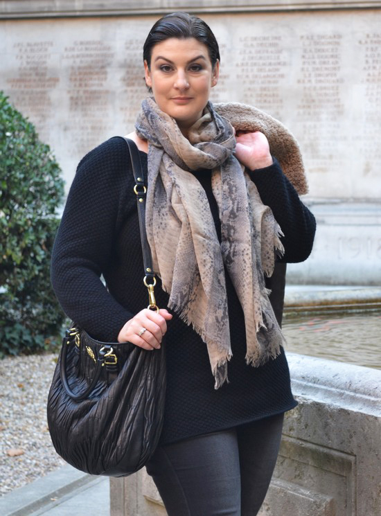 Tu vas me faire changer d’avis sur l’imprimé python, ton écharpe a un joli rendu qui doit être lié à la qualité de la matière. Le pull est très beau également, la maille est sympa. Le seul bémol pour moi, les bottes même si ça va avec le reste de la tenue. Mais enfin ça, ça n’engage que moi puisque les goûts et les couleurs…