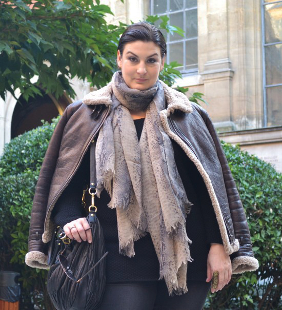 je trouve ces photos très class ! j’aime beaucoup le noir, je trouve qu’il fait chic si on l’associe à des petits détails comme ton foulard que je trouve sublime (d’ailleur j ‘ai relevé le site, on sait jamais ).Et le pull et le sac avec le bombardier sont superbes aussi