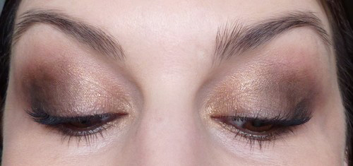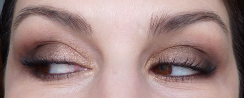 Et donc, selon cette inspiration, j’ai marié le Smut et le Patina de MAC, un peu de Gilt by Association (noir/or) pour accentuer l’outer v, et j’ai ajouté du liner brun doré métallisé Essence). Ah oui, tout ça avec, en guise de base, un fard crème the Body Shop que j’avais oublié dans un coin (se présente en petit tube avec embout mousse), un taupe assez léger. No crease à déclarer, d’ailleurs.