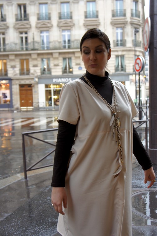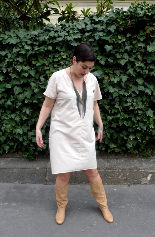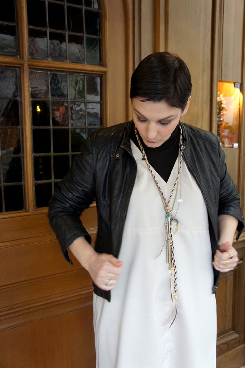 Moi non plus, je ne suis pas fan de la robe seule, trop « lingerie » à mon goût…En revanche, j’aime beaucoup la façon dont tu l’accessoirises : bijoux, petit cuir noir bien old, sous-pull, bottes…