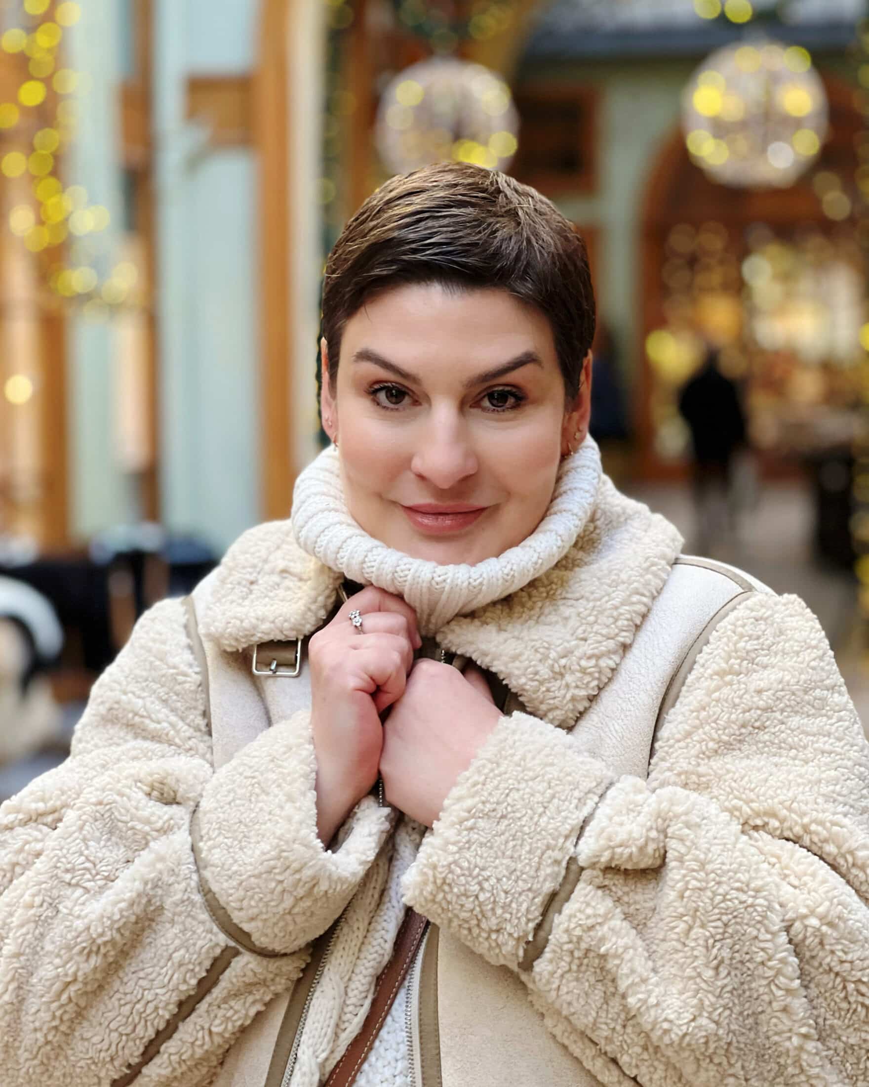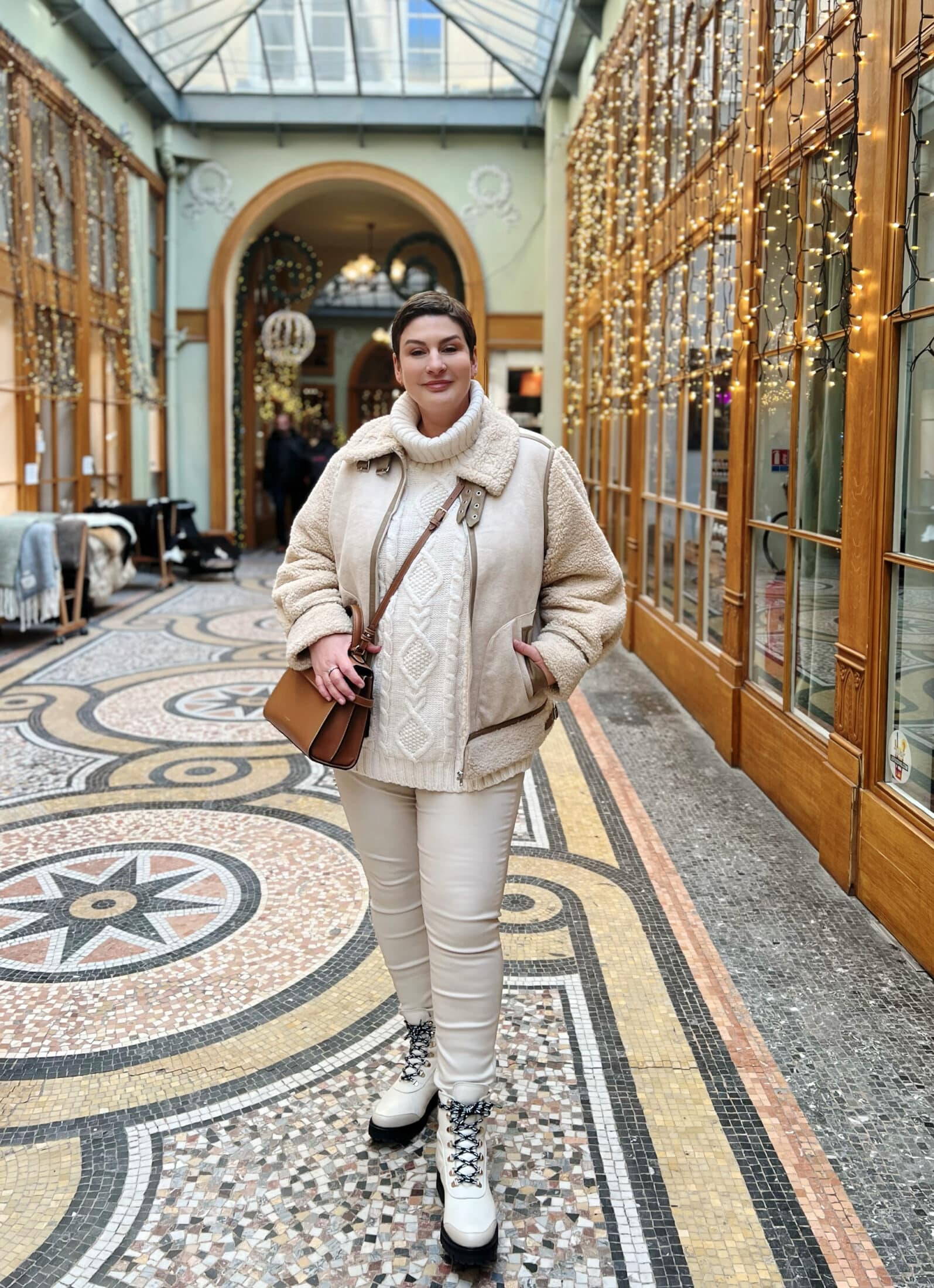 Je suis assez d’accord avec l’idée de ‘déguisement’ ou de personnage soit parce qu’on essaie de « créer » quelque chose qu’on aime , soit – c’est plus conformiste mais tellement quotidien- pour se conformer à l’occasion ou aux personnes qu’on va rencontrer. L’esthétique ‘ski chic’ , pourquoi pas -sans le ski, no sport please- . Surtout la ‘veste doudou’ qui a l’air trop réconfortante. C’est vrai que ces couleurs claires te vont merveilleusement bien (pour le coup ce ne sont pas mes couleurs car trop pâles pour moi, enfin je trouve ..) et cet endroit … il faut vraiment que je retourne Galerie Vivienne!
