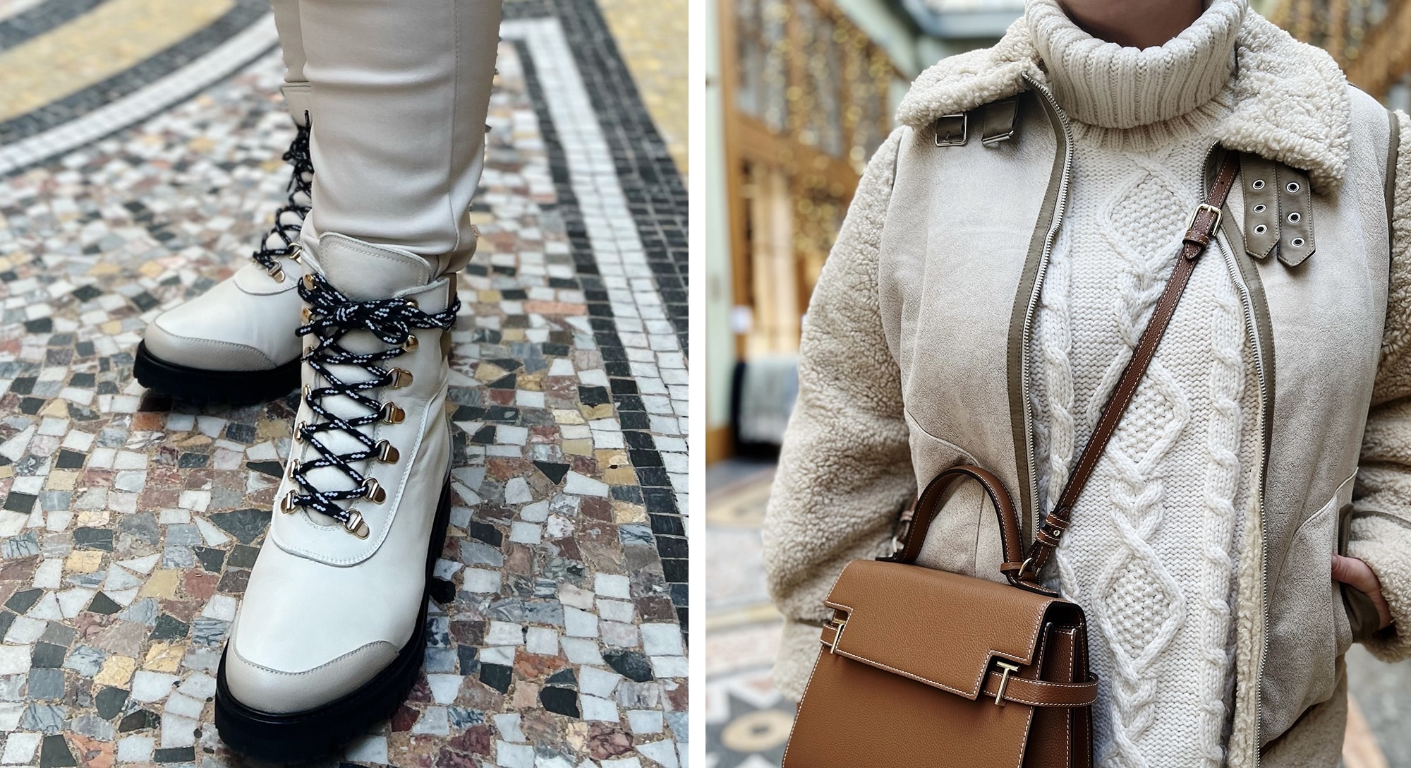 Le pull est chaud mais pas trop donc on peut survivre à l’intérieur sans devoir l’enlever (je déteste devoir enlever mon pull ou mes chaussures, ça ruine la tenue), le blouson tient vraiment chaud une fois fermé, le jean enduit est aussi une matière à réserver à l’hiver (ajouter un damart dessous si nécessaire), et les boots fourrées ne peuvent clairement être portées à Paris que par vrai froid.