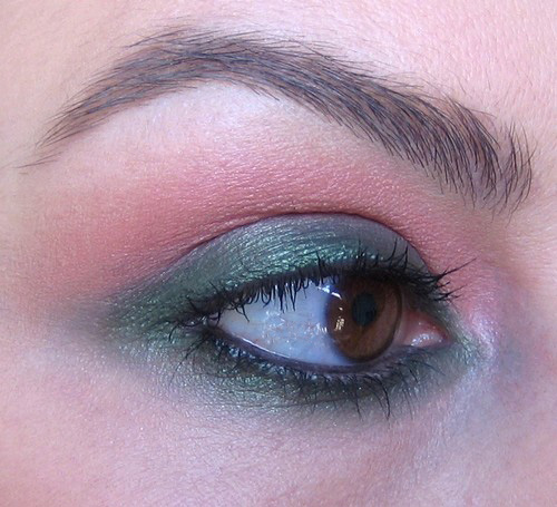 Fard poudre MAC Humid (vert foncé irisé d’une pointe d’or) par-dessus la crayon