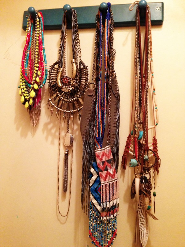 Pour mes colliers je les ai mis sur un porte manteaux classique 5 ou 6 boules qui se fixe sur un mur ,ce qui me permet même le luxe de les ranger par couleur ,pareil pour les foulards !! elle est pas belle la vie ? ;)