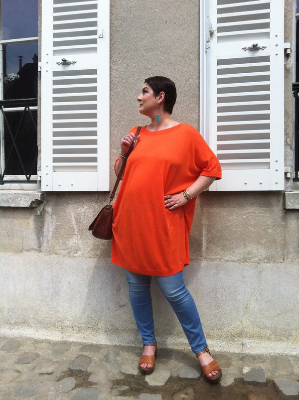 Très joli look Hélène ! La couleur orange donne du tonus à une tenue ! Moi en été j’adore les tuniques ou robes courtes, souvent très colorées, avec un large pantalon blanc … en lin, je trouve tjs ça si confortable et chic :-)