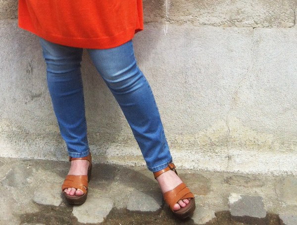 Voila une tenue à la fois passe-partout (dans le bon sens !), confortable et seyante. Idéale pour tous les jour quoi ! Et j’aimerai être brune pour porter du orange et du jaune … sur les blondes ça dénote ;-)