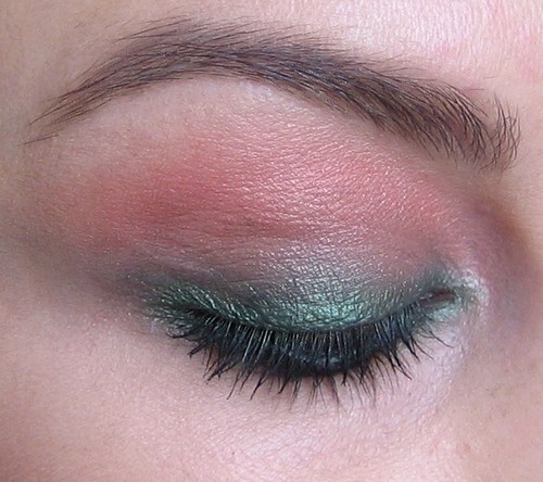 Fard poudre MAC Humid (vert foncé irisé d’une pointe d’or) par-dessus la crayon