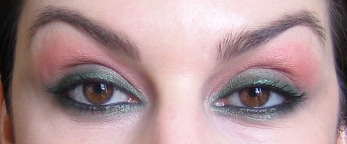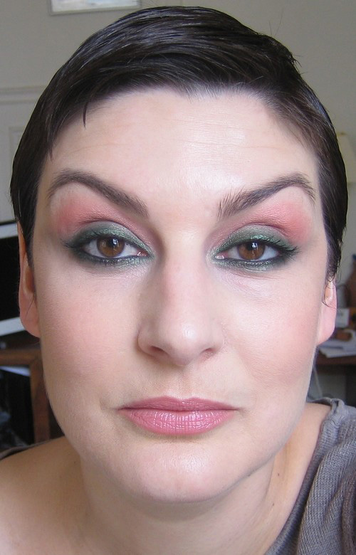 Uh, je suis pas sûre, vert anis + corail ça va faire beaucoup de couleurs claires / vives… faudrait un trait plus sombre au ras des cils, pour équilibrer le tout, je pense.