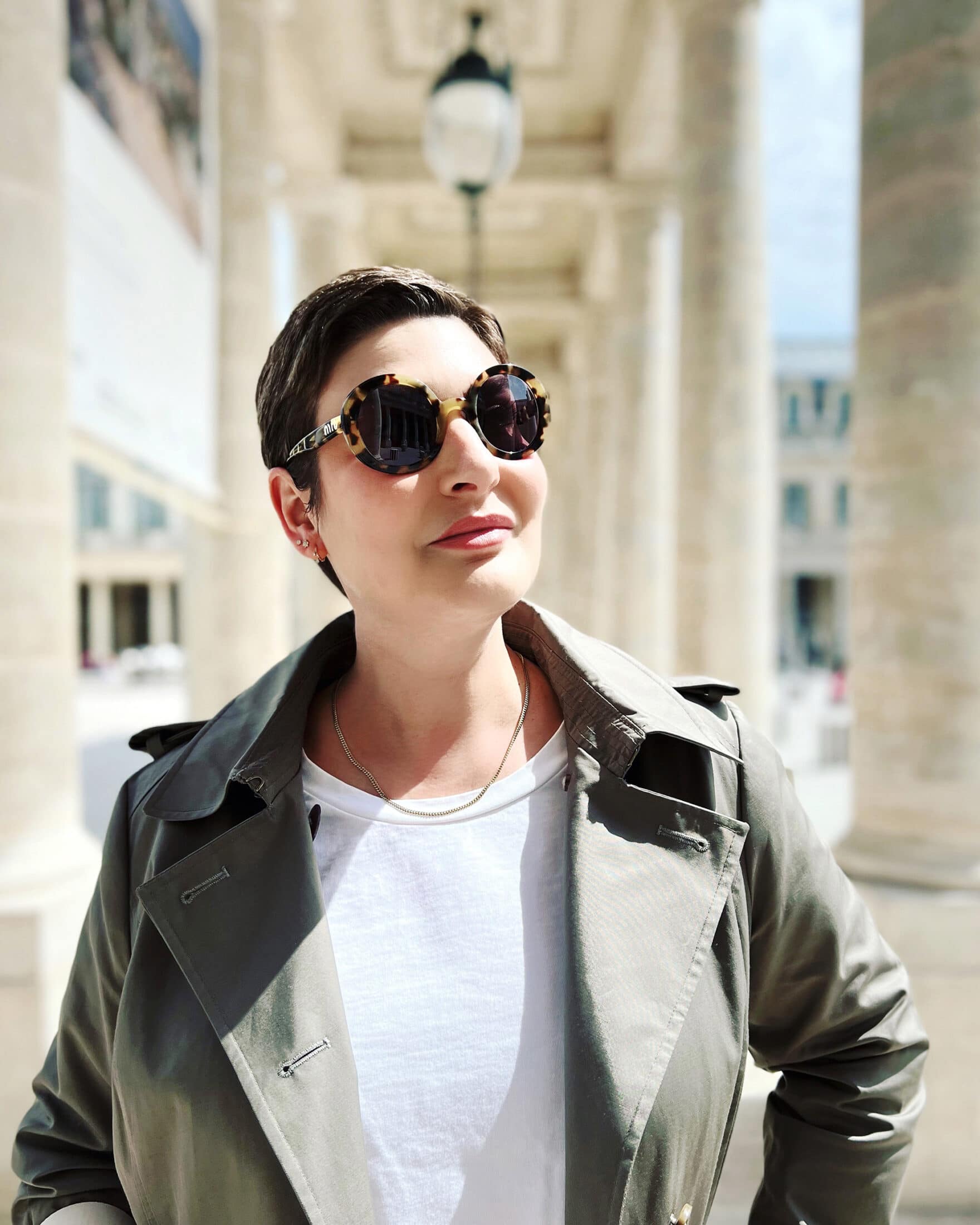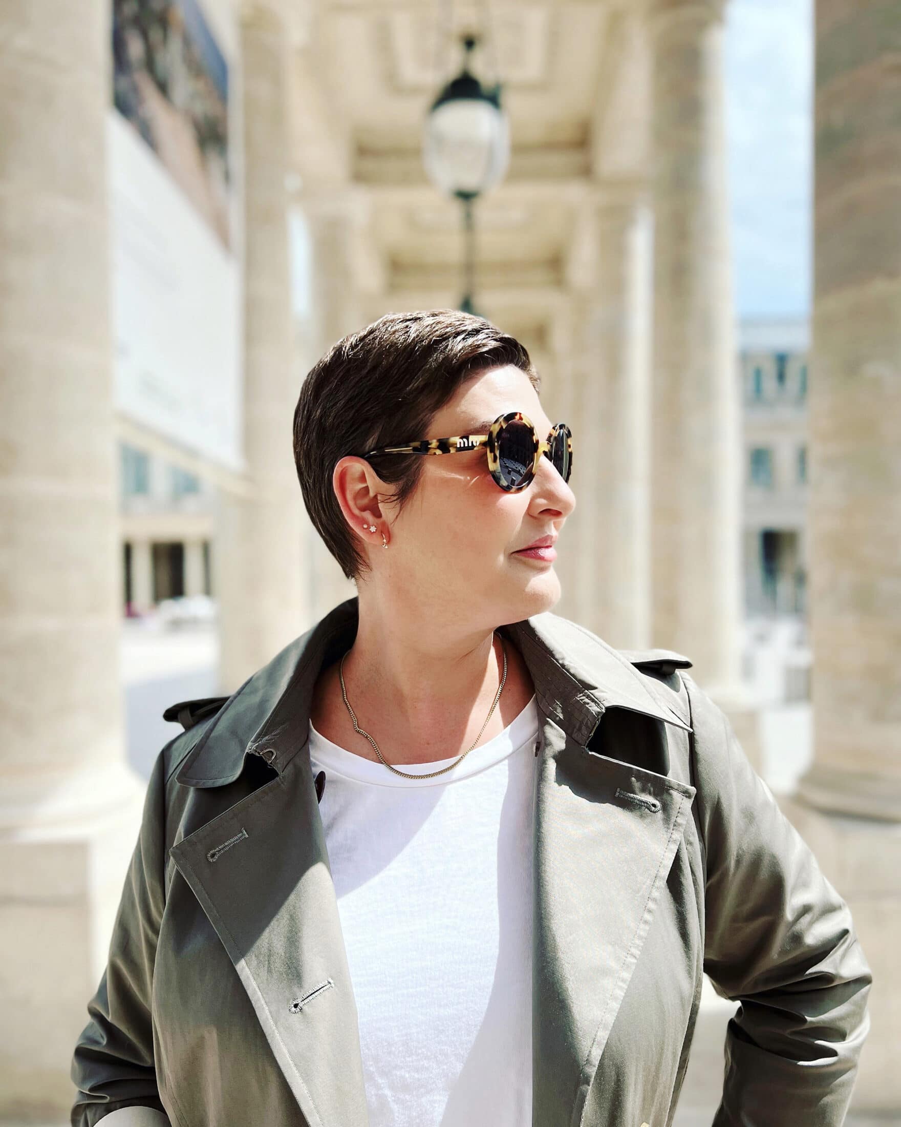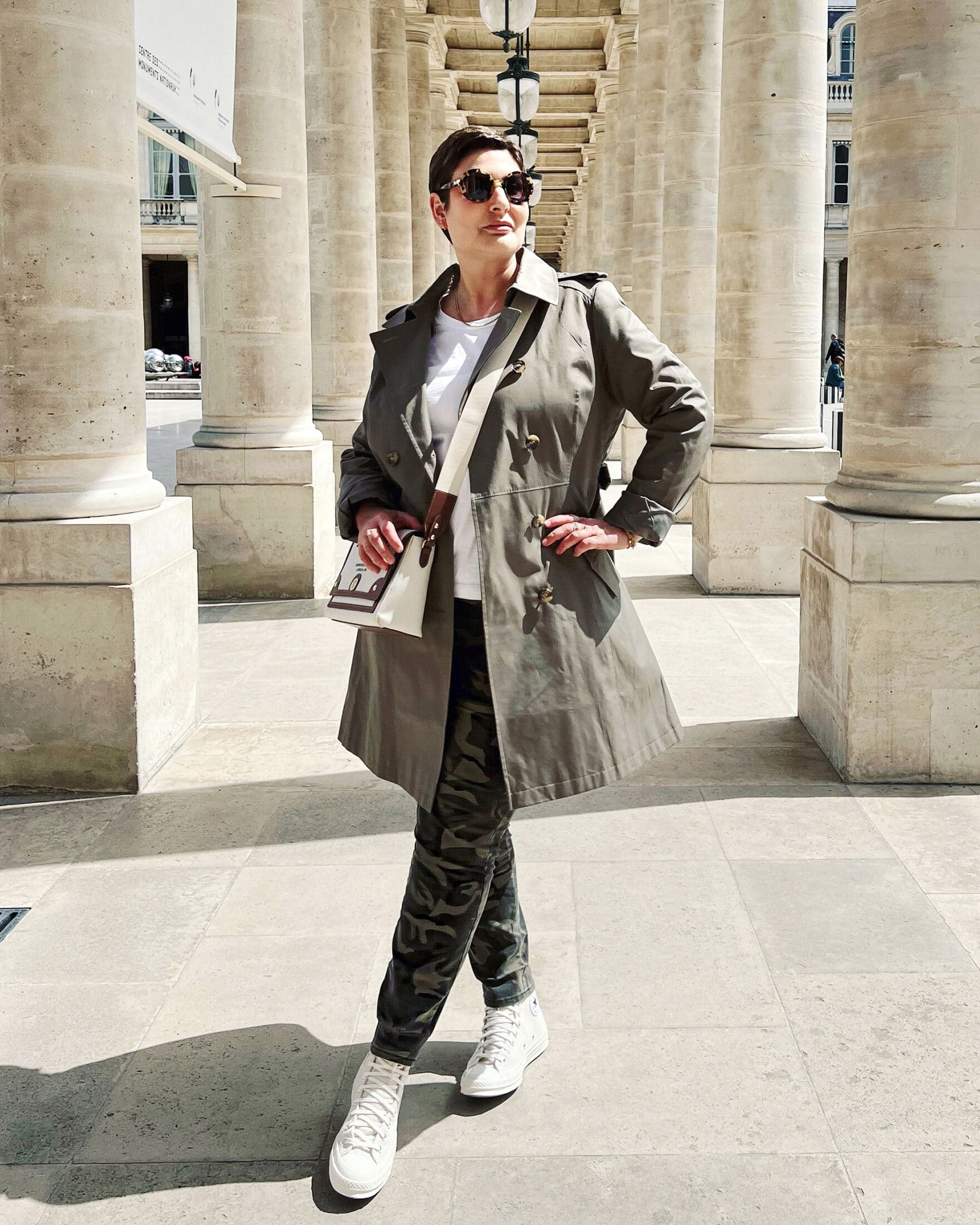 J adore ta tenue : le kaki en sous ton gris te va à merveille, et ta coupe courte met en valeur le col du trench. Le sac complete le tout : on aime 🤩