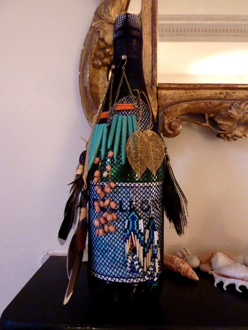 Si je me lance à faire rien qu’à copier, je taperai sûrement dans la bouteille de bière typique (genre pirate) ou dans une bouteille de true blood pour gothiquiser un peu la résille noire…