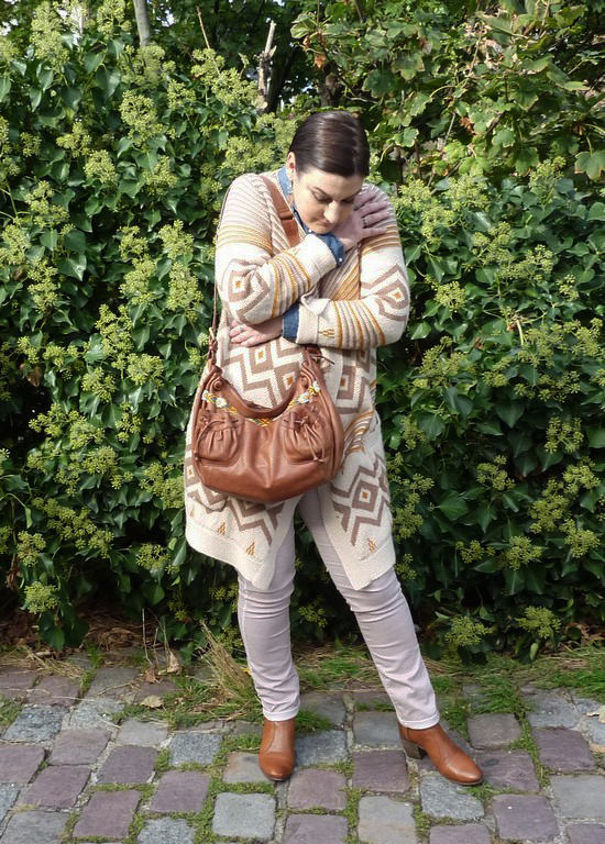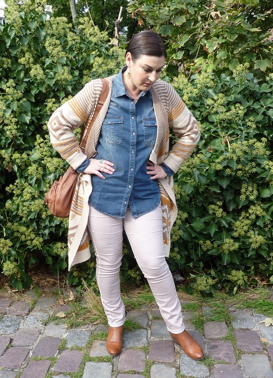 J’aime beaucoup le dégradé de couleurs beige-marron, avec la chemise en jean qui tranche bien. Les boots ont une couleur magnifique. Très jolie tenue, tout à fait ton style!