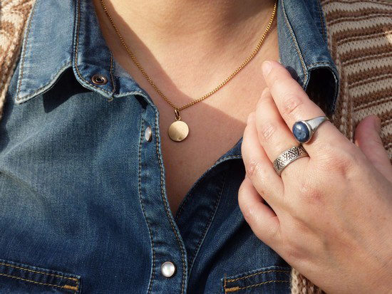 Médaille ancienne, main droite bague Harpo et bague ancienne, main gauche bague créée par Clémentine et anneau acheté en Bretagne il y a 10 ans, boucles d’oreilles Polder.