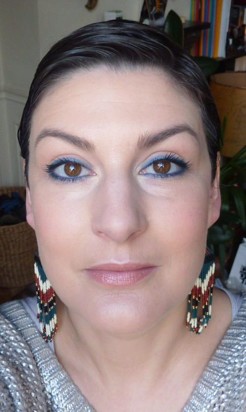 Vraiment canon ton maquillage! Et tes boucles d’oreilles n’en parlons pas! ;) On dit souvent que le bleu sur les yeux ça fait clown, tout ça… moi je trouve pas, si le bleu est bien choisi et bien porté ça peut être très classe…