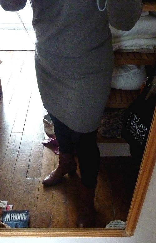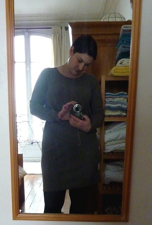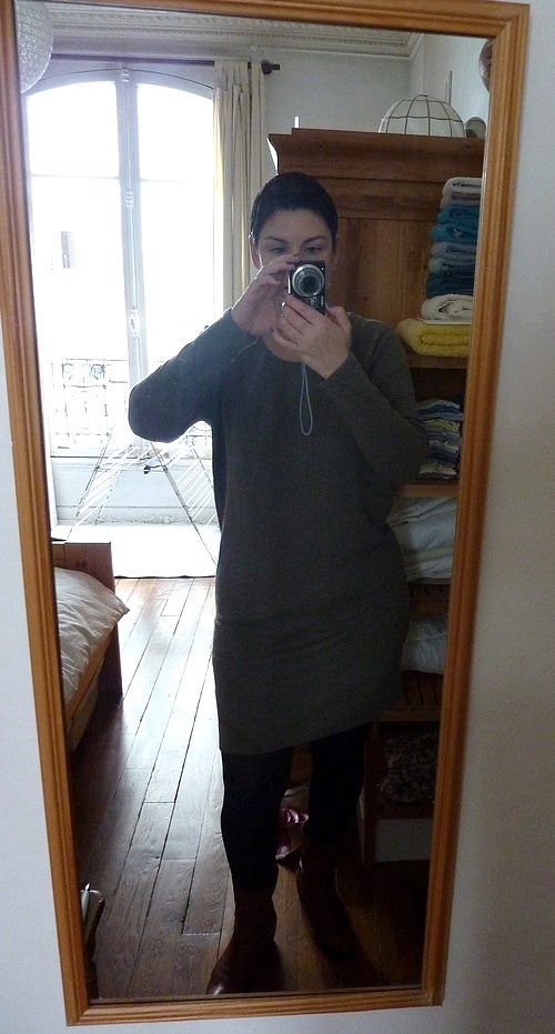 Quand elle est arrivée je me suis un peu jetée dessus pour l’essayer, persuadée qu’elle ne m’irait pas (les réflexes ont la vie dure). Et ben PARFAITE. L’hallu, le truc qu’on dirait coupé sur moi. Le cachemire est vachement beau, solide, pas tricoté lâche qui va s’abîmer en 2 lavages, le truc sérieux. Et j’adore la coupe (j’ai pris le modèle large, je voulais une robe dans laquelle j’aie pas besoin de rentrer mon ventre ;-), quand je l’ai essayée j’avais l’impression de faire 10 kilos de moins (je déconne pas, j’ai rarement vu ça). Je sais, les photos sont effroyables et ne rendent pas justice à la robe mais j’avais pas de Marie sous la main pour faire la photographe ;-)
