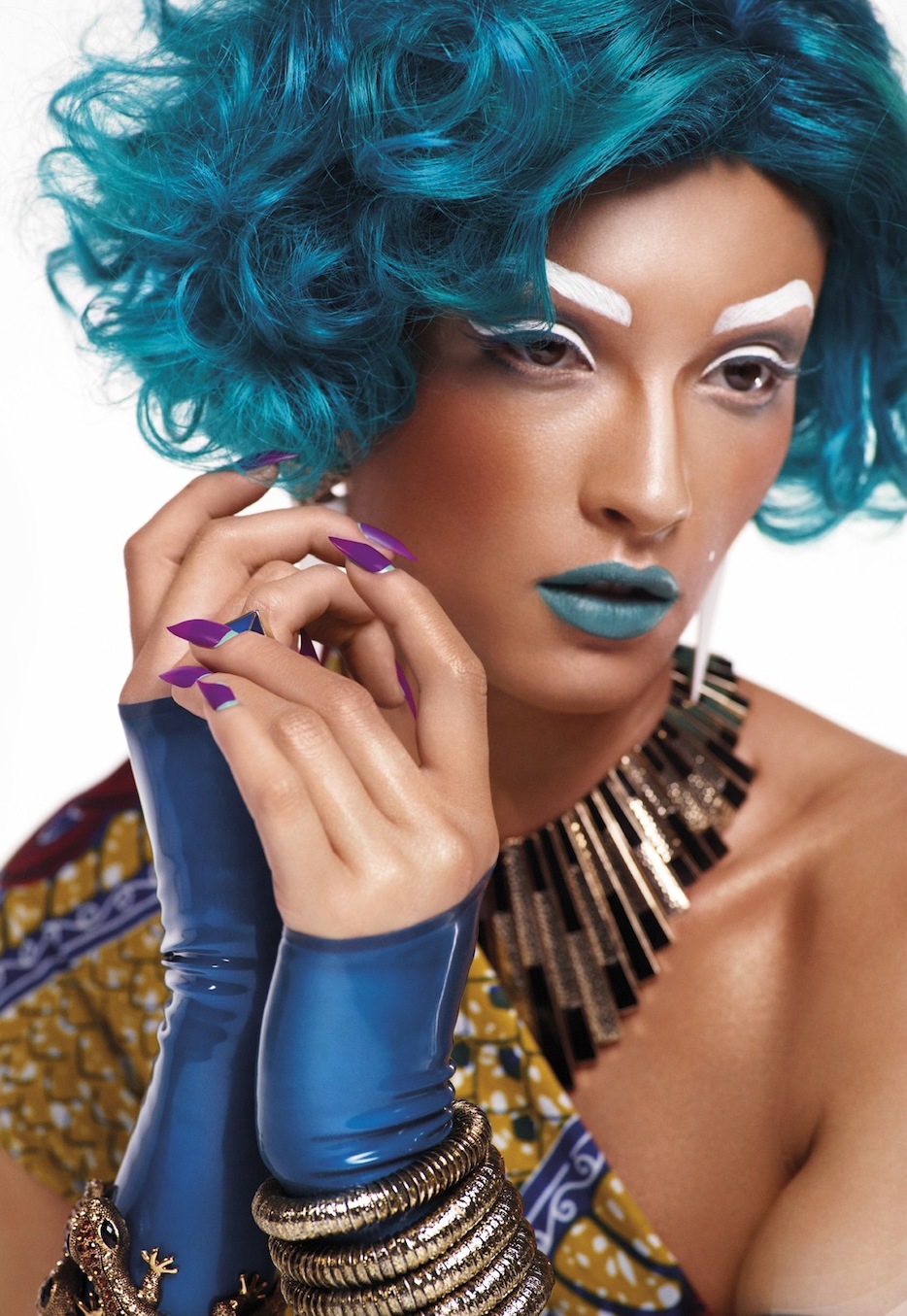 J’ai une préférence pour le second cliché. J’aime beaucoup les maquillages artistiques et je dois dire que celui-ci est très original et très réussi. La couleur or se marie divinement bien avec ce bleu glacier… Pis les formes géométriques sur le visage que l’on retrouve aussi sur la tenue et dans les gauffres des cheveux, il fallait y penser. Cela me donne des idées pour des soirées!