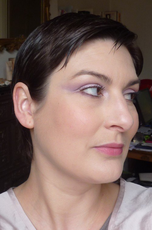 C’est marrant, avec le fard violet et les lèvres méga rose, le blush paraît presque abricot ou pêche, plus chaud quoi…