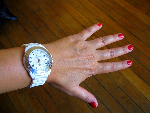 apolonia: ah mais je ne la porte pas pour avoir l’heure (je ne porte JAMAIS DE MONTRE) mais comme un bijou (en plastique, donc ;-)).