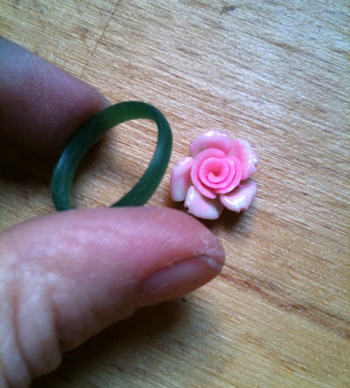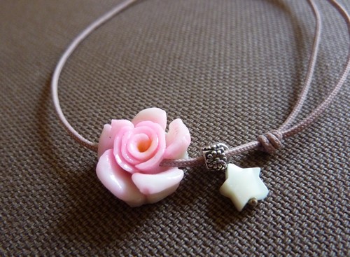 Illico je me souviens d’un pendentif rose que j’ai, en corail. Or je ne porte à peu près que des bagues. Je vais le revoir pour envisager sa transformation, et je découvre que la petite rose est pleine de trous, comme mangée :-(