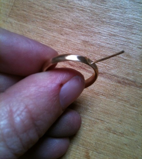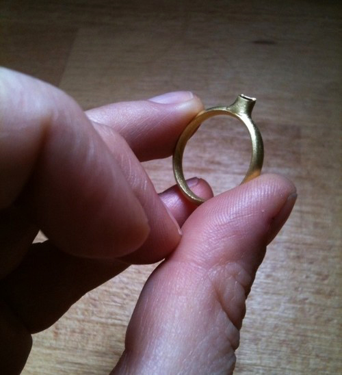 Je l’ai récupérée il y a quelques jours, elle est parfaite : l’anneau est un vrai bel anneau d’or (4,4 grammes, d’ailleurs Clémentine a dû le faire poinçonner par les douanes : au-delà de 3 grammes d’or pour un bijou, c’est la loi) qui ressemble à une alliance classique.
