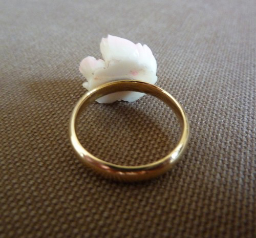 Je voulais qu’elle me monte la rose en bague (pas pour la porter en même temps que le bracelet, évidemment, mais parce que j’avais envie d’avoir les deux formes de bijou avec cette rose si ravissante) ; on a décidé qu’elle ferait un anneau en or jaune, c’est ce qui va le mieux avec la couleur de la rose (oeuf corse on a essayé avec de l’or rose, pour voir – ça mettait moins la rose en valeur).