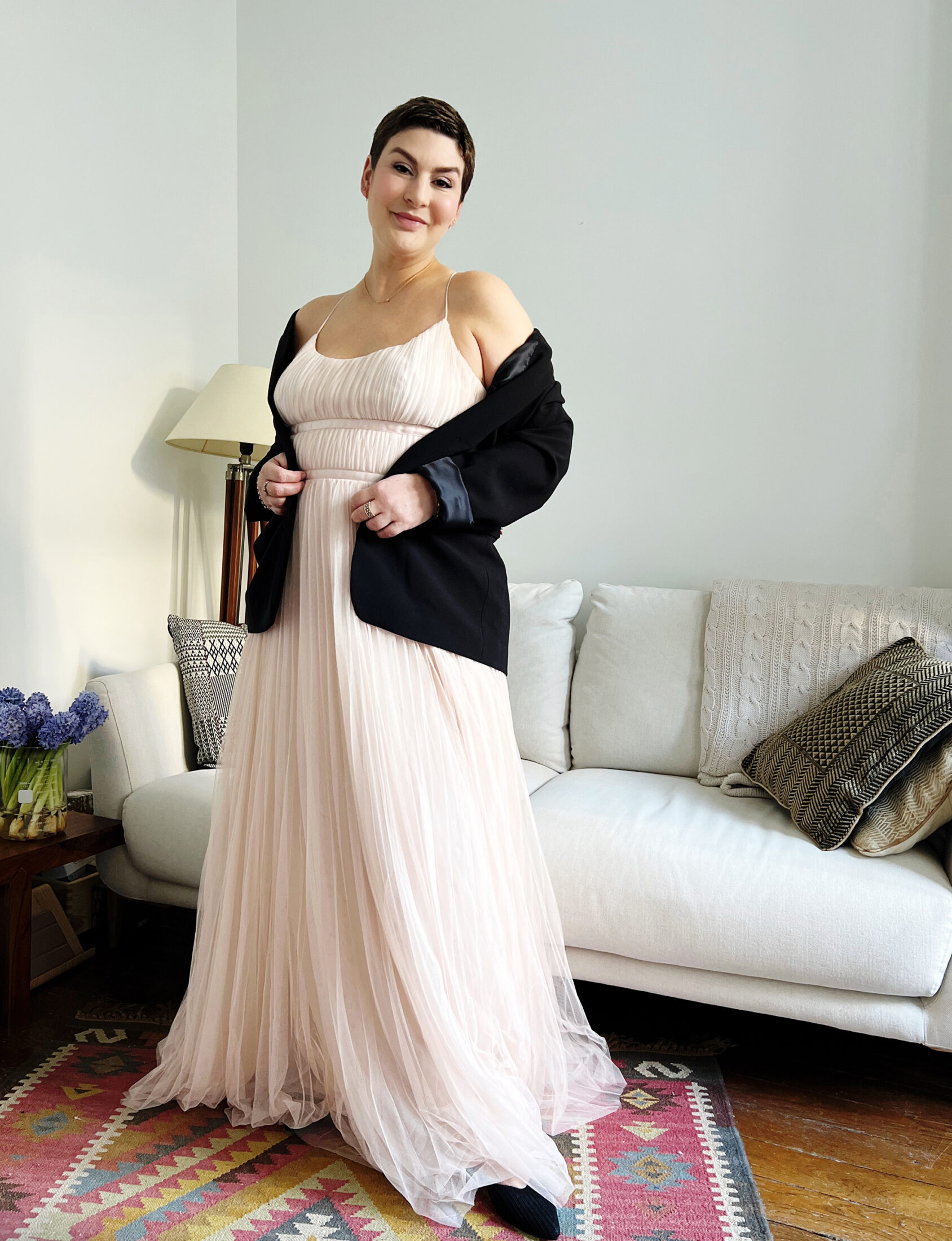 Je tiens à la dé princessiser un peu quand même, y compris pour une soirée très chic sinon ça va faire sous-préfète (d’où les ballerines plates, aussi) ; pour ça le blazer noir est parfait, j’adore l’accord des deux univers.