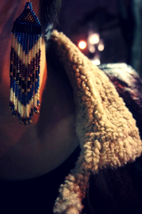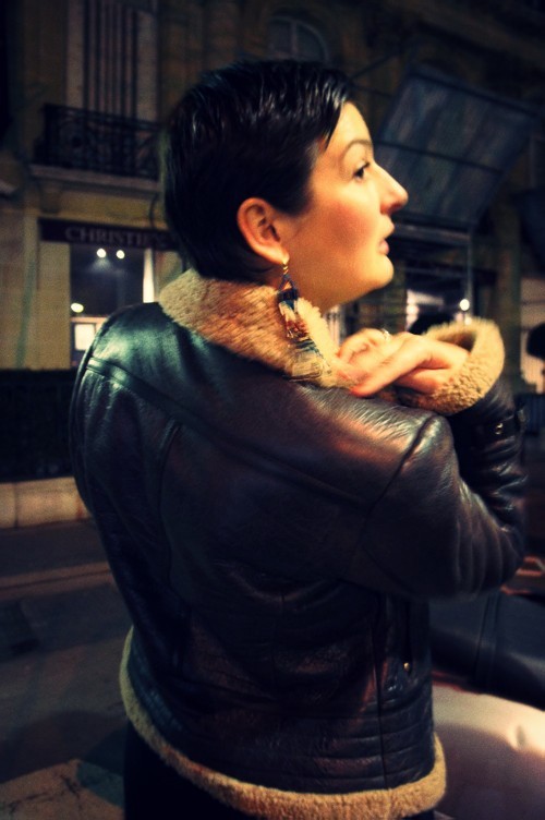 Magnifique bombardier (je dois avouer le rouge aux joues que jusqu’à aujourd’hui j’ignorais ce qu’était un bombardier…), et sublimissimes boucles d’oreilles!! On dirait que ces deux (trois^^) -là étaient faits pour se rencontrer! Ils se complimentent l’un l’autre!