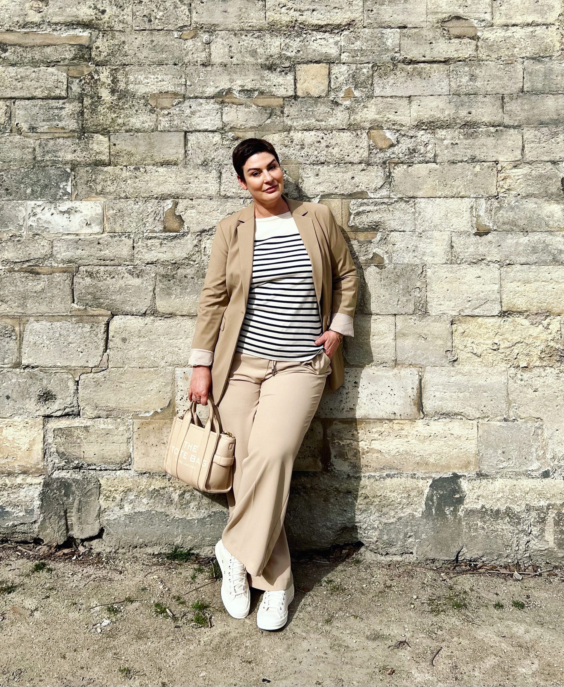 Wahou ! Super ce look ! J’adore le beige je trouve que c’est une couleur super élégante. Le blazer c’est vrai que c’est super strict, ça donne un air austère, et pourtant avec des variantes qui sortent de l’ordinaire comme une couleur autre que noir/ bleu, un imprimé, ou une matière plus souple on peut faire des looks BCBG super sympas. Pour le printemps j’en ai un blanc imprimé fleuri que je porte avec une ceinture a la taille. et pour les saisons plus fraîches j’en ai un rouge brique en velours côtelé (et le pantalon assorti ça fait toujours son petit effet le velours a ce côté un peu brillant que j’adore) . Et effectivement je ne les porte pas avec des chemises (je déteste porter des chemises de façon générale…) Et côté chaussures je l’associe aux baskets, bottines plates ou mocassins.