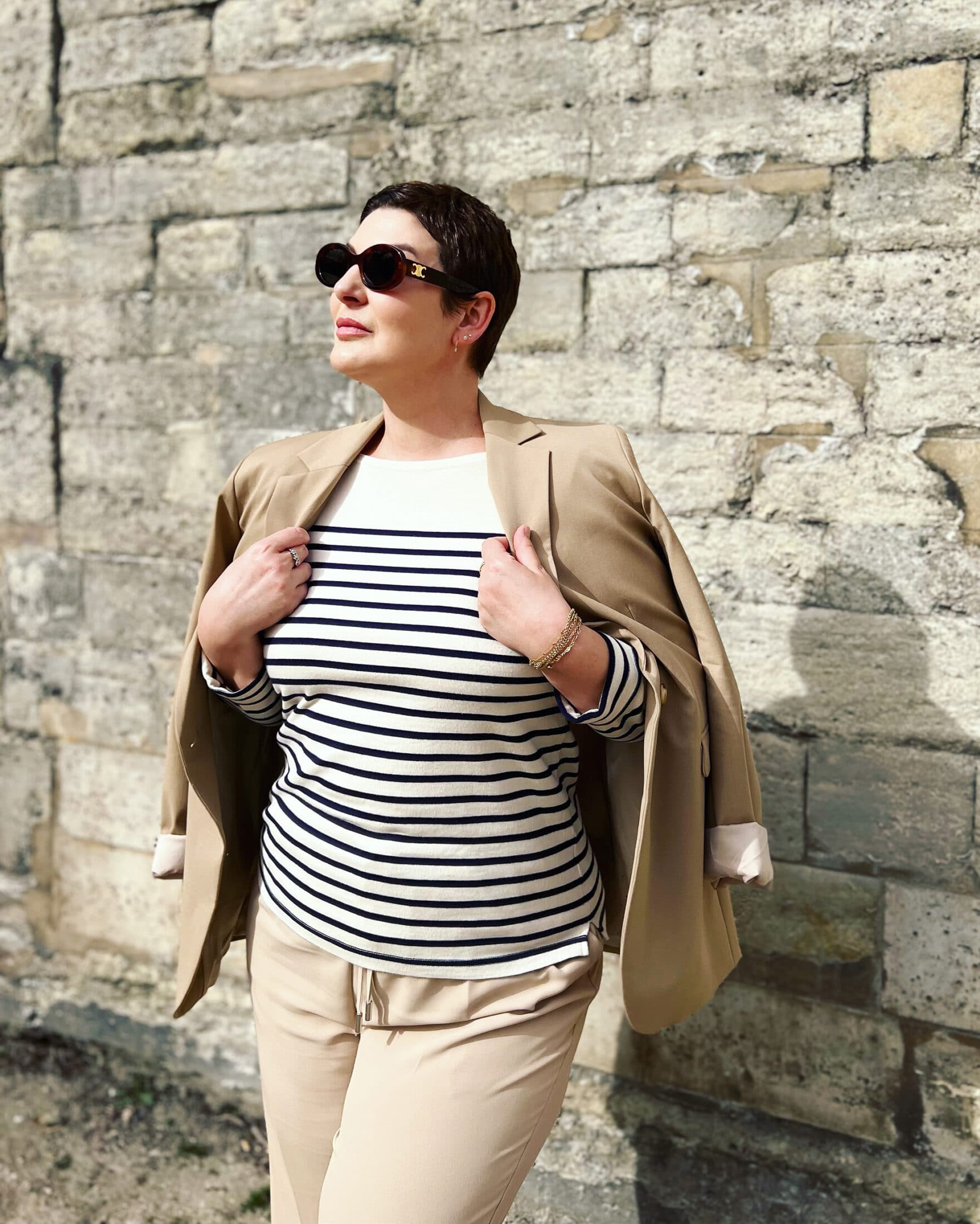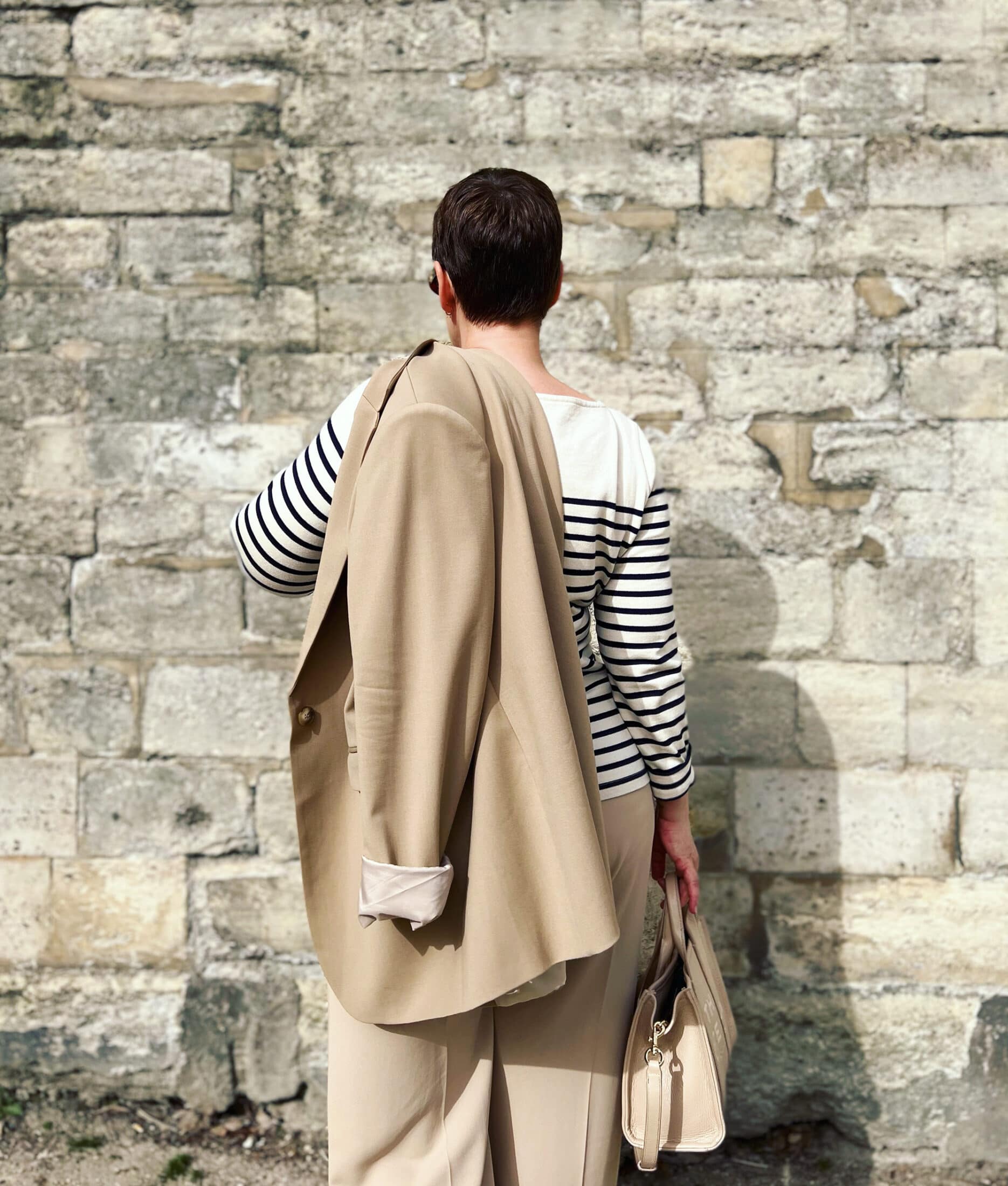 Alors moi j’en ai trouve un a ma taille et c’était pas gagné complètement par hasard dans une petite boutique du centre de Montpellier. (On s’en fiche) 🤣 un caramel clair réversible en beige. Très simple et pas structuré mais blazer quand même me dit la vendeuse… J’avais bien vu que ce n’était pas une redingote sacré bonsoir ! J’ai craqué… Et j’ai pris une marinière… Armor Lux … Je me suis fait des cadeaux. J’achète très peu de vêtements mais j’aime qu’ils me conviennent. Bon après je ne souhaite pas ressembler à Bozo le clown.