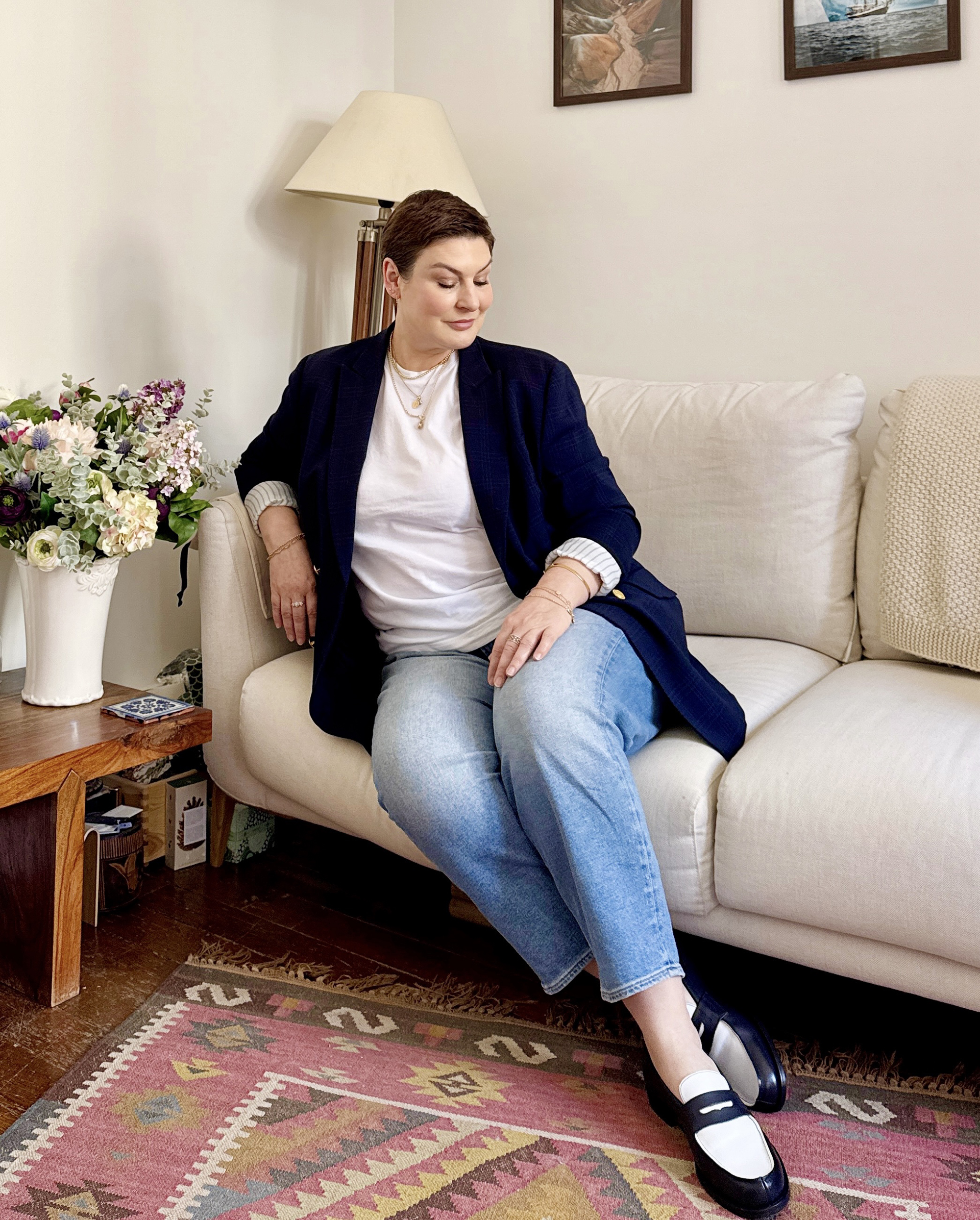 Blazer Sumissura, tee-shirt Arket, jean American Eagle, mocassins Finsbury