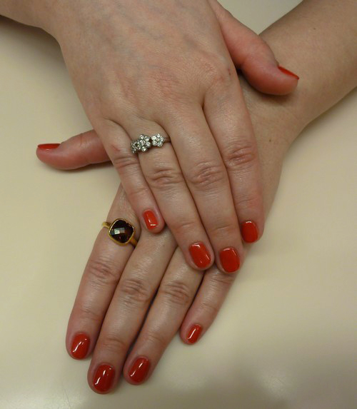 vous allez rire mais je trouve les ongles « apres 15 jours » plus joli que ceux qui viennent d etre faits ,,, c’est parce que je trouve que quand le verni ne prend pas tout l’ongle ca affine les doigts… et quand je met du verni je laisse d’office cet espace qui est en fait la repousse de l’ongle sur la derniere photo ;)