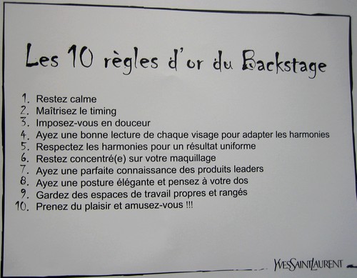 Les équipes maquillage YSL (60 maquilleurs) et coiffure L’Oréal (50 coiffeurs) étaient super impressionnantes d’efficacité, de rapidité et de gentillesse cool en même temps ; l’organisation était nickel vu le monde à gérer (j’ai bossé 10 ans dans le tourisme, je sais de quoi je parle), l’ambiance du Défilé gaie et électrique…