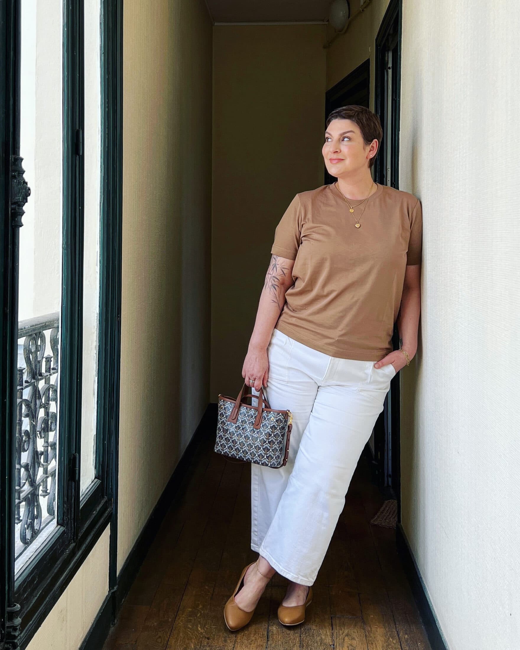 Très jolie proposition, très fraîche et élégante ; c’est tout toi. Je vais être honnête, j’ai une morphologie similaire à la tienne ainsi qu’une coupe courte et lors de l’engouement pour les t-shirt blanc il y a quelques années je portais beaucoup ça avec un pantalon fluide marine ou une longue jupe. Jusqu’à ce que je me vois en photo. Je me trouvais vraiment énorme. Donc le problème n’est pas tant le t-shirt mais l’association des couleurs et matières. Depuis je porte plutôt du lin blanc que le fameux ras-de-cou. Un léger mieux. En tout cas merci pour la reco Arket j’ai commandé une chemise blanche au top très classe. Prends soin de toi!