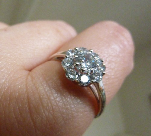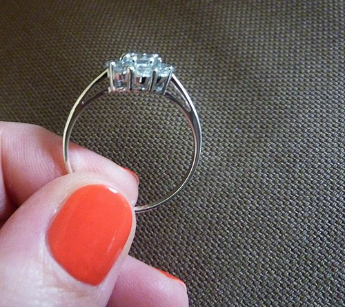 Elle est très jolie cette bague, je lui trouve un petit air ancien. Quand je l’ai vu, elle m’a tout de suite fait penser à la bague de fiançailles de ma mère et aussi à celle de ma grand-mère qui y ressemble, mais pas en strass ;-)
