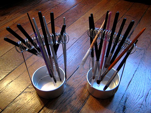 Mais je me perd parfois : je dois tournicoter mes pinceaux dans tous les sens pour trouver celui que je veux. Alors je cherche un autre système… Je devrais peut-être les diviser en plusieurs pots, hum….