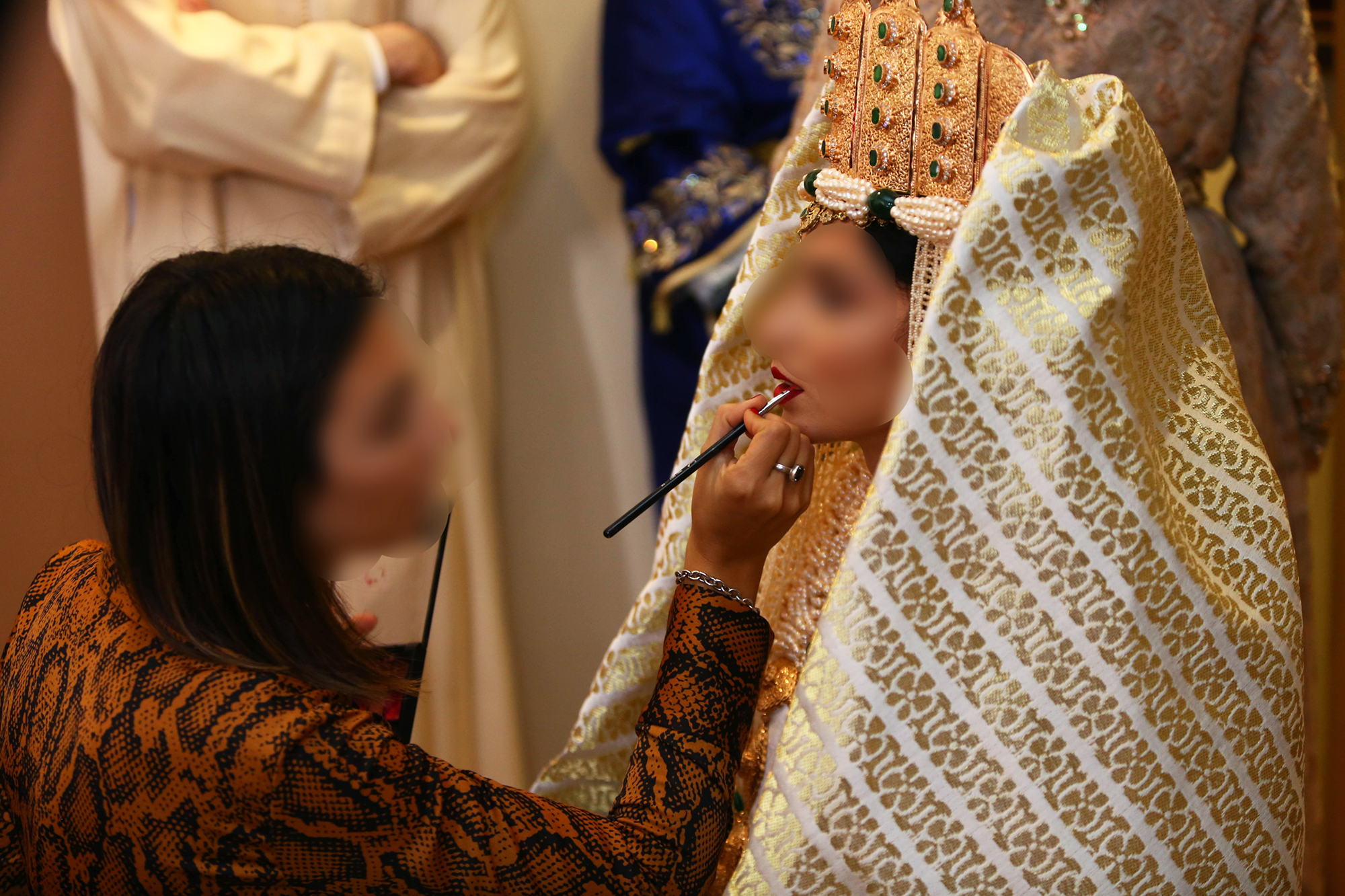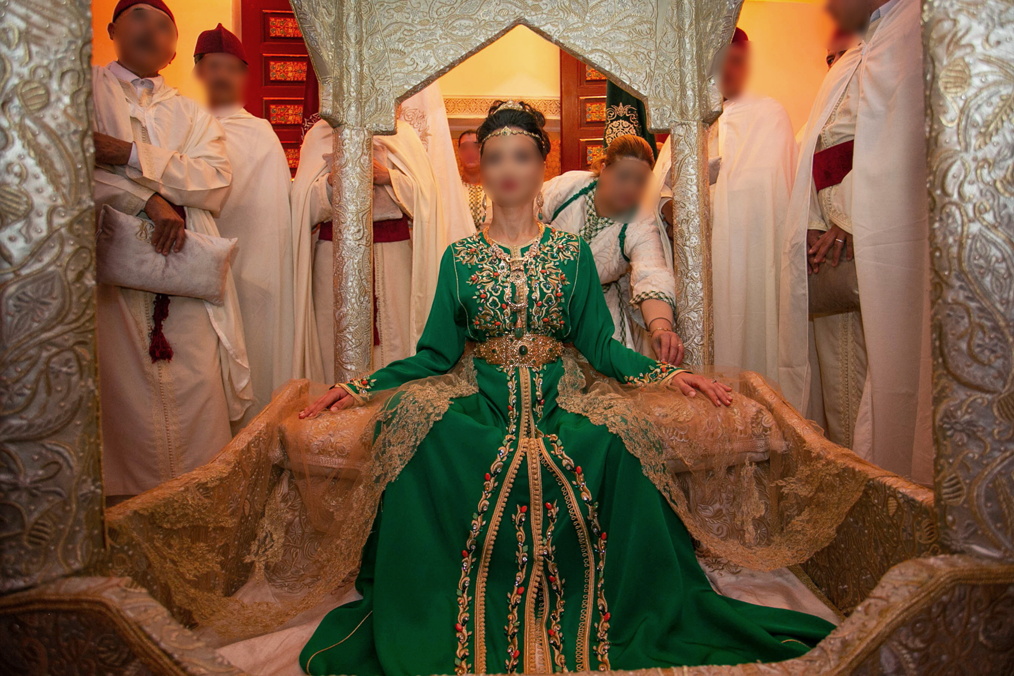 Yasmina : Des 3 ou 4 matrones à l’air sévère qui sont là pour veiller au respect des traditions ancestrales, pour assister la mariée et pour resserrer les ceintures des caftans des filles de la famille.