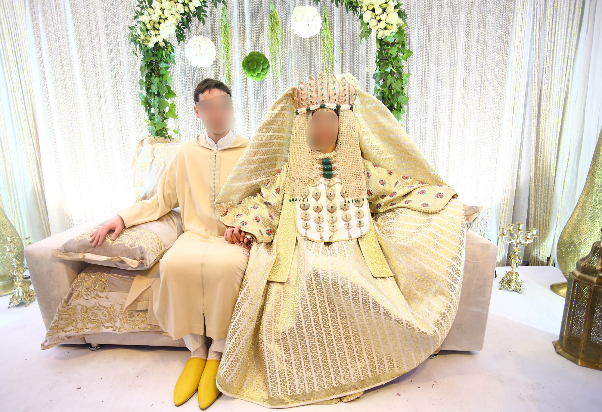 Selma a brillé dans un caftan vert et doré. Elle a ensuite enduré avec patience et grâce une Nefertiti, la tenue traditionnelle des mariées de Fès : une coiffe de 20 kilos et une cape de princesse égyptienne. Puis elle a fait le tour des tables pour saluer chaque convive dans un caftan blanc et doré symbole de pureté et enfin, elle a découpé la pièce montée dans une robe de mariée occidentale.