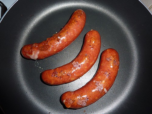 elise: ben non les saucisses à la poêle c’est vachement meilleur qu’à l’eau, parce que ça croustille. C’est une version soft du barbecue. Tout le monde fait ça voyons (en tout cas dans les gens que je connais).
