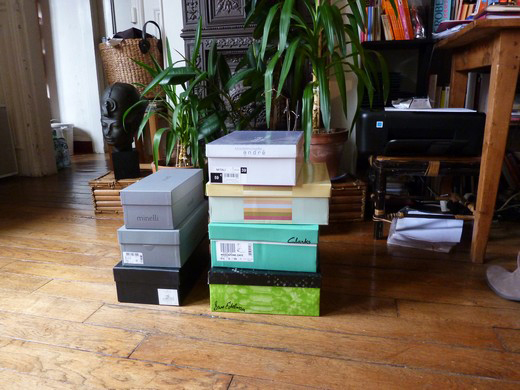 Je suis tout à fait incapable de jeter des chaussures sauf si elles sont au bout du rouleau. Bon déjà j’ai fait des progrès, je n’achète plus de chaussures qui ne me vont pas :)