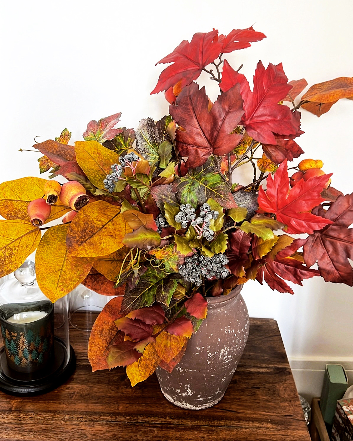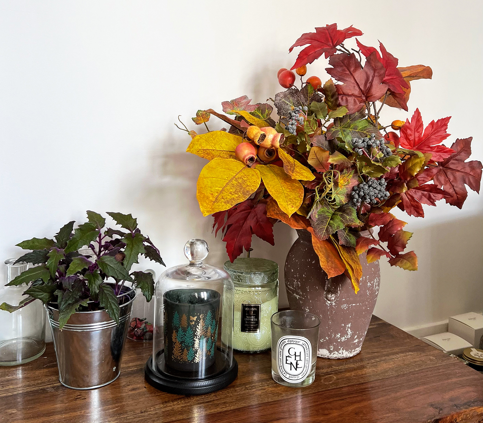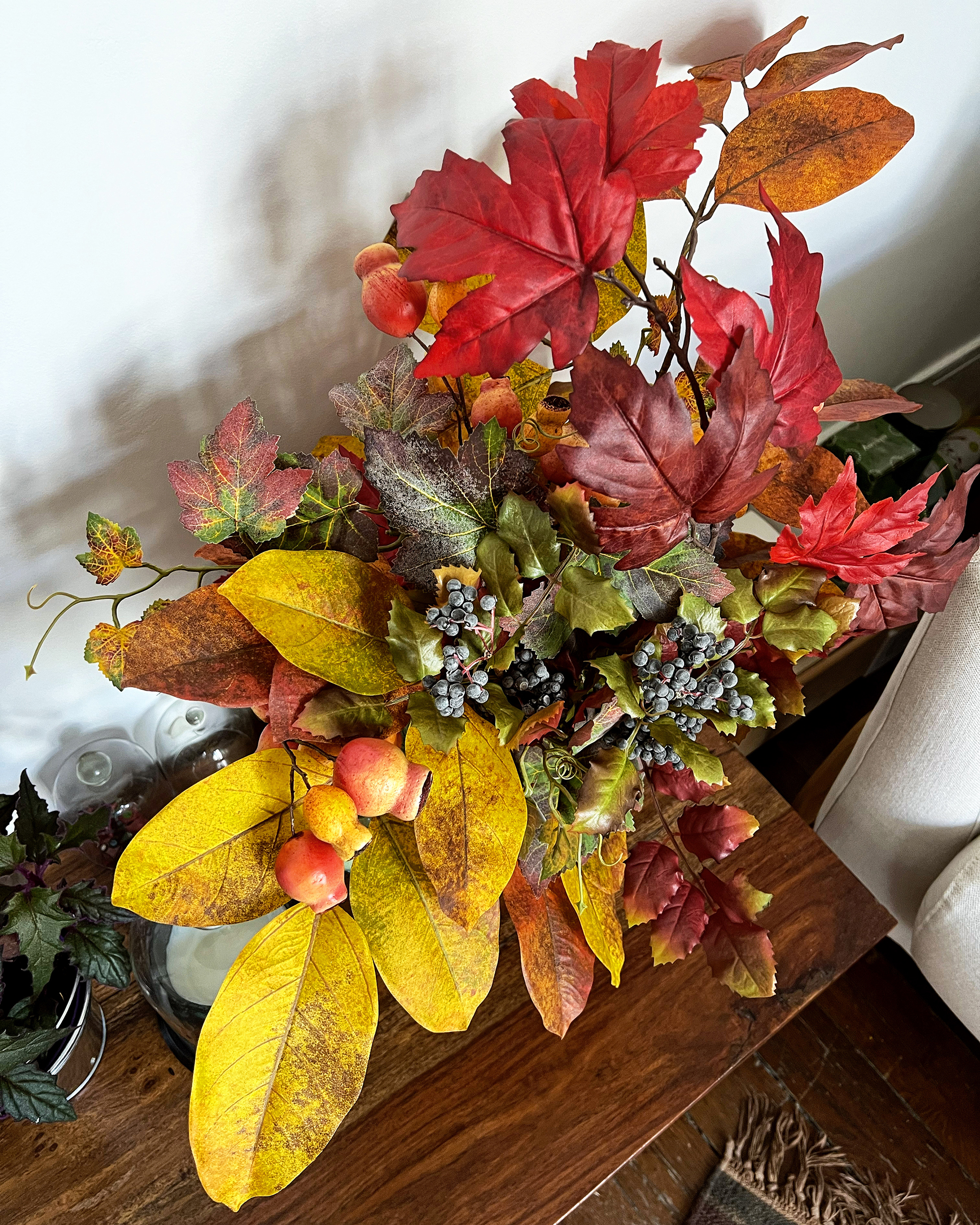 A cette saison la nature me manque encore plus que d’habitude et, les beaux feuillages d’automne n’étant pas faciles à trouver chez les fleuristes (et à conserver), j’ai acheté des trucs artificiels.