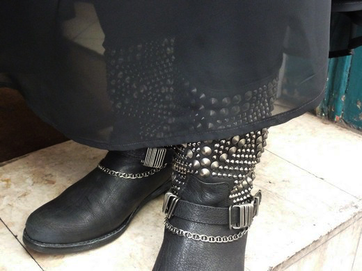 Oh les clous des bottes qui apparaissent par transparence dans le bas de la robe (et quand tu marches, j’imagine)! C’est la glace et le feu réunis ;-)
