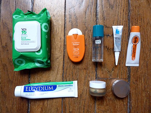 (J’aime bien le cote « debrouille » du voyage (parfois :))-ca toujours decouvrir un super produit, o par necessite, o par envie.) En plus, je trouve que les aeroports (yay, duty free! :)) font les super kits de voyage, taille reglementaire, maintenant. J’etais tres etonnee de voir un kit Clarins miniature (avec que des bons trucs+ vraie jolie trousse) a une prix vraiment raisonable)