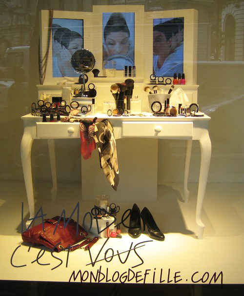 C’est une vitrine super réussie! Elle te représente très bien, en fait elle représente très bien… ce blog! Claire, féminine, pleine de make-up… je ne sais pas si ils se sont inspirés du design du blog mais je trouve que c’est tout à fait en harmonie…