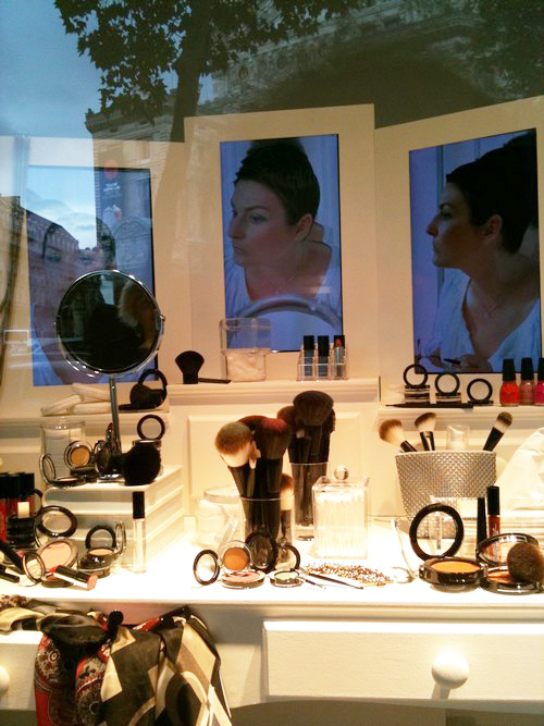 J’ai profité de ma petite escapade à Paris pour venir faire un tour Boulevard Haussmann hier. Et j’ai vu ta vitrine. Elle est belle, c’est chic et sobre, très girlie mais de très bon goût. Vraiment, elle est belle cette vitrine. j’ai bien aimé la pointe de couleur sur les pinceaux, les escarpins et le sac, un peu cliché certes, mais tellement glam. Bref, c’est canon, j’adore, bravo!