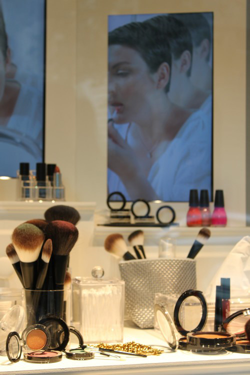 Elle est très chic, et j’ai adoré les détails comme le miroir rond à pied (en plus sur des bouquins ;-) ), les vernis à ongles, les traces de poudre sur les pinceaux, et le sac en cuir au sol, si beau et qui pour moi te correspond très bien….En plus l’idée du miroir-vidéo-triptyque est géniale, on peut voir les vidéos sous trois angles, c’est chouette !