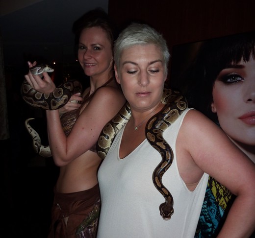 Jamais je n’aurais pu approcher les serpents, rien que d’y penser j’en ai la chair de poule , breeeeeeee, alors l’avoir autour du cou, là je défaille ( Beldandy, à quand un shooting MUFE avec des pigeons autour du cou?)
