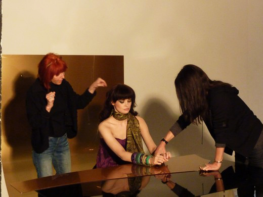 Et je suis toujours estomaquée quand je vois le nombre de produits sur la console des maquilleurs pro, comme ici. D’ailleurs plusieurs photos m’ont surprise : celle avec l’éventail en prévention des chutes (riche idée, mais je pense -peut-être à tort- que ça doit être plus facile quand on maquille quelqu’un d’autre plutôt que soi-même. Et en plus un maquillage à 4 mains, c’est pas courant de voir ça !
